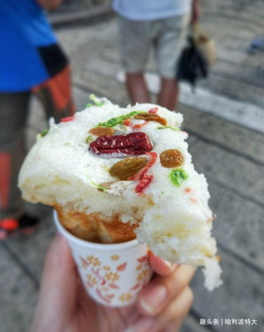 桥头糕的口感确实不错,5元一个(每人限购2个)味道很特别,很有密云乡土特色。特别是糕上面点缀的青红丝,看上去有种“小时候的味道”。糕里面的馅也用料充足,豆沙、葡萄干、瓜子仁、红枣搭配,吃起来又糯又香甜,后悔当时没一下买两套(还想吃就得重新排队)。
