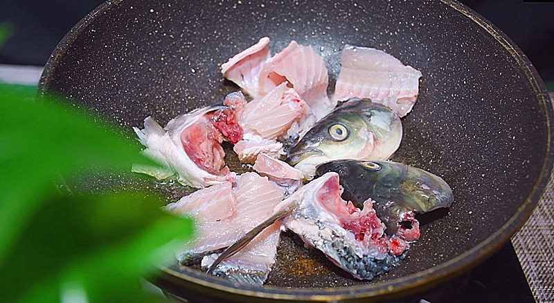 3:还有重要一点,鱼骨不要丢掉。用热油将其煎一下,随后倒入热水用大火炖煮5分钟,使其汤汁洁白。这样再用它来当作底汤,最好的水煮鱼滋味更浓郁,更好吃。