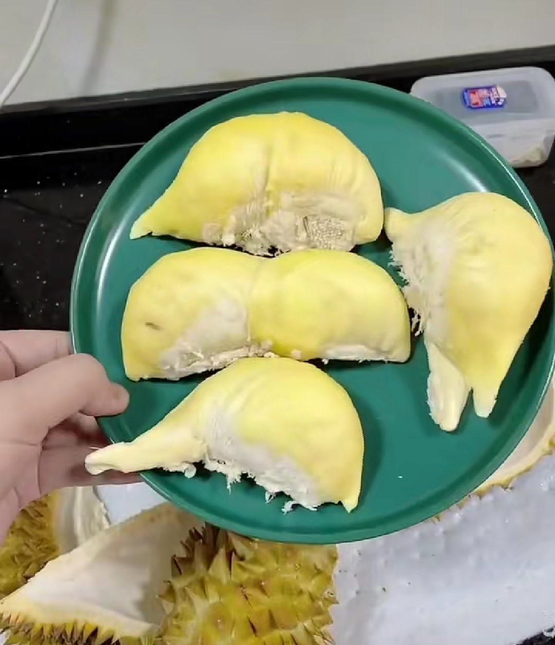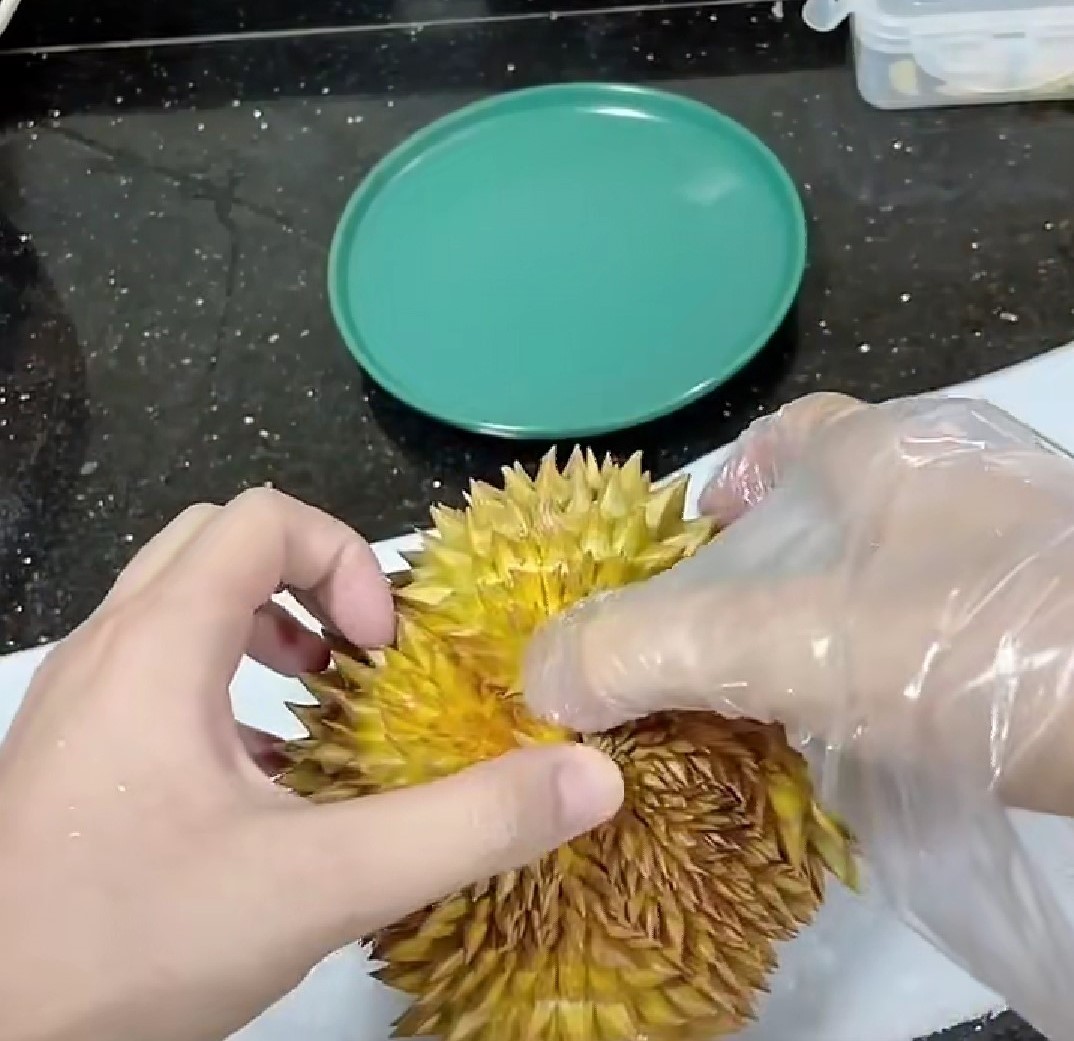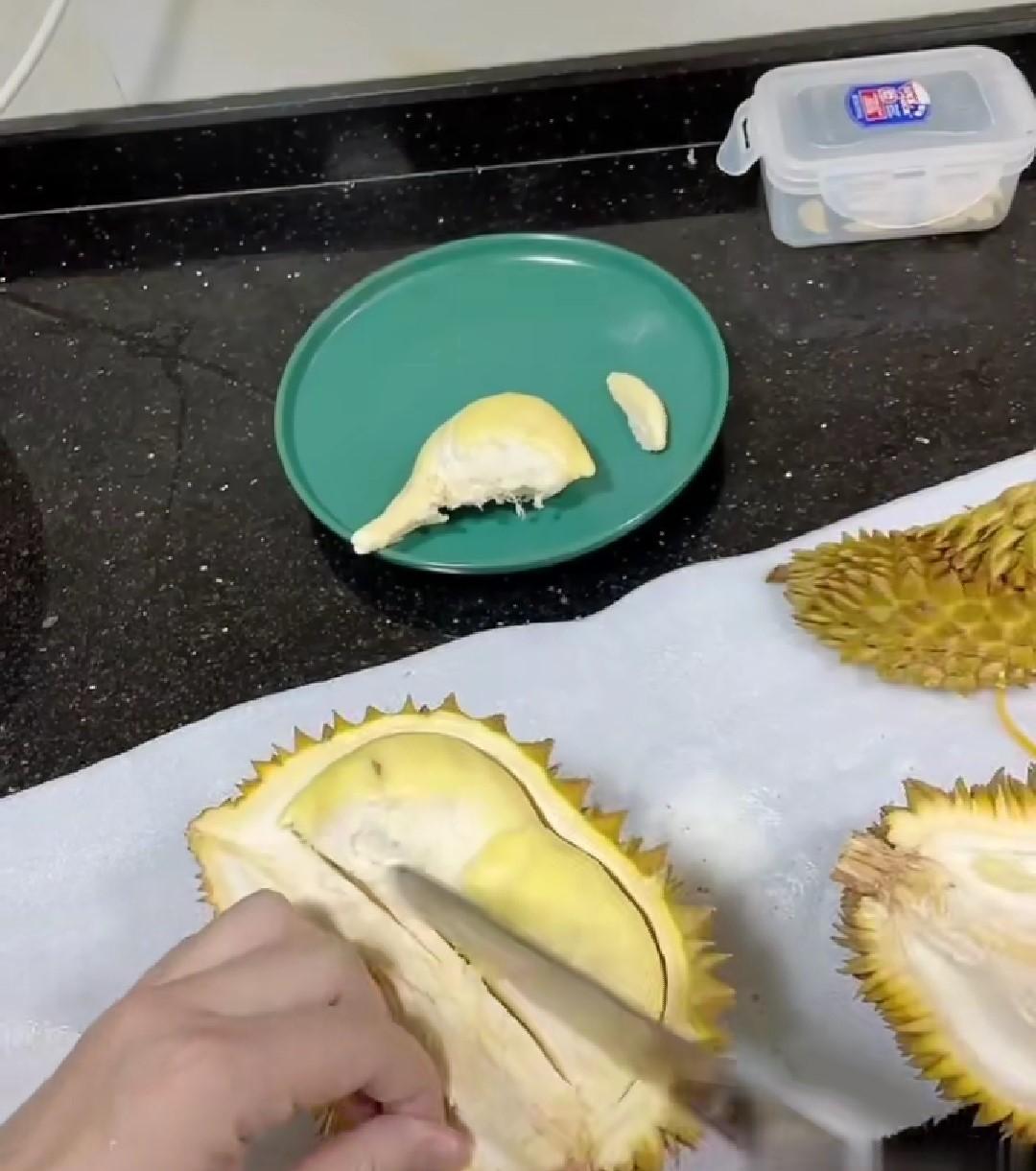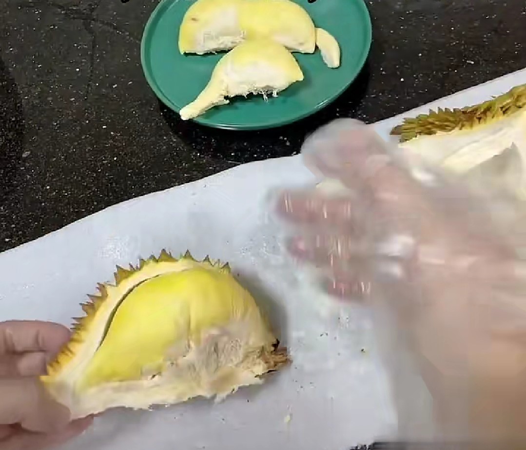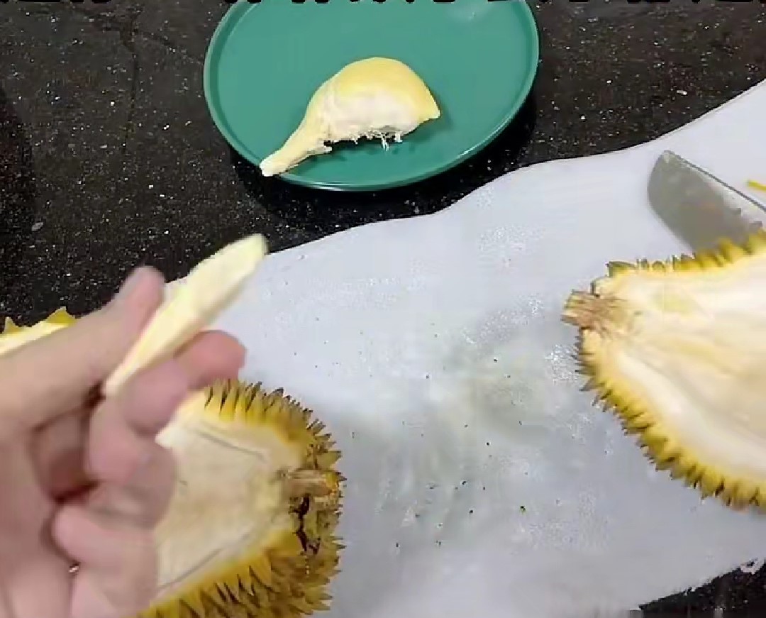 老哥终于要开榴莲了,下面就是见证奇迹的时刻,手起刀落,一个挺饱满的果肉出现在了眼前,仔细一看,旁边还顺带了个mini的版本,还没成年就被挖出来了啊(笑哭)第一瓣就开出一大一小,开了个好头。