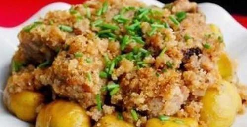 材料:小排 350克、蒸肉粉、栗子 150克、姜 2片、料酒 1大勺、甜面酱(或酱油)、1大勺 盐 、糖 、胡椒粉 适量