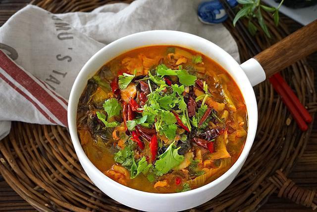 材料:羊肉350克、酸菜200克、红干椒5个、盐1茶匙、葱1棵、香菜2棵、生姜3片、蒜头2粒