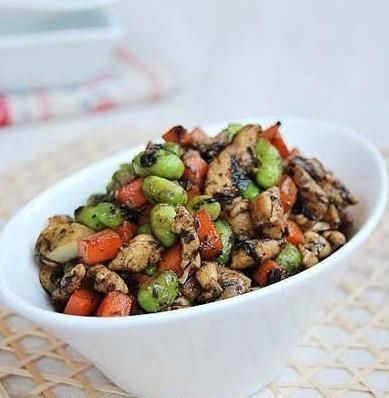 材料:鸡胸肉1小片、毛豆50克、橄榄菜2大匙、胡萝卜1/3根、蒜1瓣。