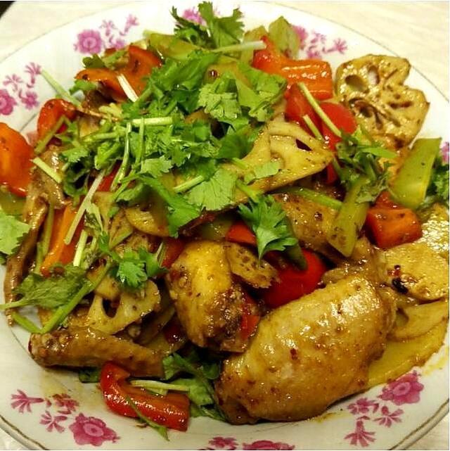 材料:鸡翅8个、土豆1个、莴笋1个、藕1节、生姜、蒜瓣、大葱、红辣椒若干、火锅底料100G、生抽一勺、绍兴黄酒;