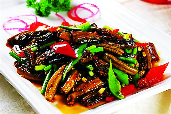 2、 锅内放入油,烧至八成热时,放入鳝鱼段炸成火红色,倒入漏勺内,锅内放入底油,用葱姜蒜炝锅,添汤加入酱、白糖、醋、绍酒、花椒水、味精、玉兰片、胡萝卜、鳝鱼段,待汤烧开后;