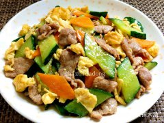 家常营养小炒 主料 瘦肉120克青瓜半根胡萝卜8片鸡蛋2只盐2克鸡精2克生抽半勺胡椒粉2克生粉3克 步骤 瘦肉切片,加生抽、胡椒粉、生粉、花生油,抓匀腌制十分钟。 青瓜切片、胡萝卜