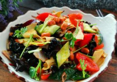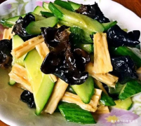 腐竹炒黄瓜 食材:腐竹,木耳,黄瓜,葱花,酱油,糖,盐,淀粉, 做法 1、腐竹、木耳泡好,黄瓜、腐竹切菱形、木耳、葱花备用。 2、油烧热,下葱花爆香,放腐竹和木耳翻炒,少