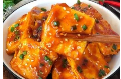 糖醋脆皮豆腐 材料:老豆腐一块 调料:醋15ml、番茄酱30ml、生抽10ml、盐2g、糖10g、水淀粉15ml、葱花、芝麻适量 做法: 1、将所有调料除葱花外混合在一个碗内,调匀备用。 2、老豆腐切