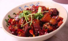 干煸红烧肉 食材:五花肉5000克洗净改刀成大块,下入水中(水中加八角、花椒、葱姜、盐,另添糖色40克上底色)小火煮30分钟至熟透,捞出改刀成小块备用。 做法: 1、炒锅滑透,下