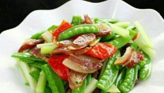 荷兰豆炒腊味 做法 1.将荷兰豆去蒂,撕去老筋,浸泡洗净备用; 2.枸杞浸泡洗净备用; 3.腊肠切薄片备用; 4.蒜切碎末备用,用红薯粉调勾芡粉 5.锅内热油,五六成热时下蒜泥爆香,放