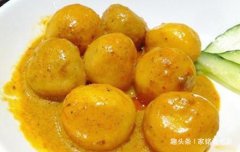 咖喱鱼蛋 材料:鱼蛋、洋葱、中等大小土豆、块状咖喱、胡萝卜、油 做法: 1、将鱼丸清洗一下,土豆和胡萝卜洗净去皮,切滚刀,洋葱切块; 2、锅中放30克油,油热后,先下胡萝卜