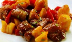 菠萝烧鸭 材料:鸭肉、菠萝、葱、生姜、蚝油、酱油、料酒、白糖、油 做法: 1.鸭肉洗净剁成块,菠萝处理好切小块, 葱切小段,姜切片。 2.起锅烧开水,放入鸭块,焯至变色,捞出