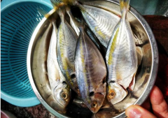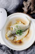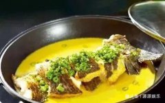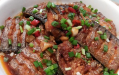 招牌黄焖青鱼 制作: 1、青鱼1条(重约1750克)去鳞放血,去内脏,洗干净,剞花刀,抺盐20克腌制10分钟左右。 2、不粘锅烧热,放毛菜子油150克,将鱼背面放锅底,煎至金黄捞出。