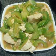 苦瓜煮豆腐 准备食材:苦瓜、豆腐适量,姜、生抽、盐适量 制作步骤: (1)苦瓜洗净,切片,用淡盐水浸泡一下,去苦味。 (2)热锅中放油,炒苦瓜,放盐,生抽。放入豆腐及姜片