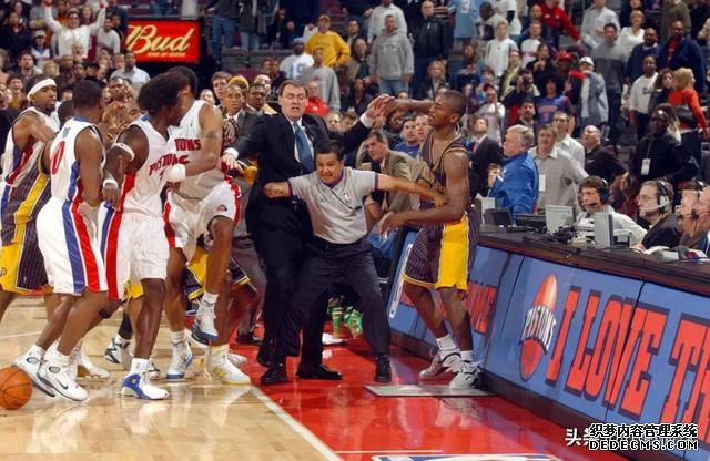 球员和球迷从观众席打到比赛场地,局面已经完全失控了,步行者教练组意识到,必须尽快将球员送回更衣室,并以最快速度离开球馆,否则后果不堪设想。
