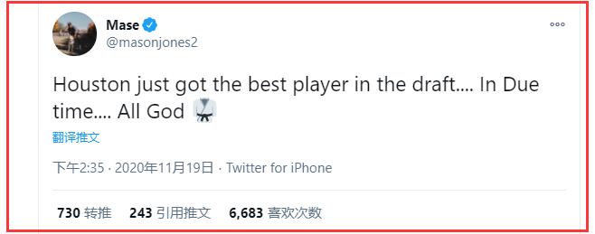 “休斯顿刚刚获得了这一届新秀里最好的球员”,这句话,是梅森琼斯与火箭完成签约后,在个人社交媒体上放出来的豪言。
