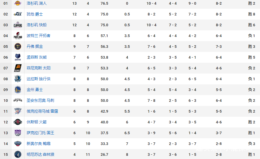 西部格局太乱了,前三由湖人、爵士和快船三队制霸,后面的开拓者、掘金、灰熊、太阳和勇士都是极其不稳定,西部前八看来要到最后才能复出胜负。值得一提的是,火箭经过两连胜后,已经反超国王和鹈鹕,告别倒数前三,在全主力回归之后,这支火箭有望重返前八。