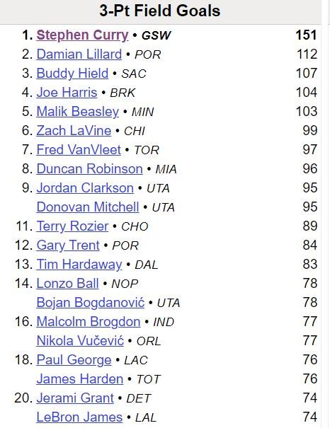 值得一提的是,在勇士昨天惜败魔术的比赛结束后(勇士本赛季第30场比赛),库里在本赛季前30场投进的三分也来到了151。截至发稿,库里本赛季投进151记三分,为本赛季全联盟投进三分最多的球员。