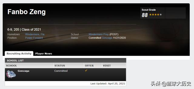 曾凡博出生于哈尔滨的篮球世家,14岁就前往美国高中发展,今年他高中毕业,ESPN给他的定级是四星高中生,评分88分,全美高中生排行则是第34位,大前锋排行则是第10位。