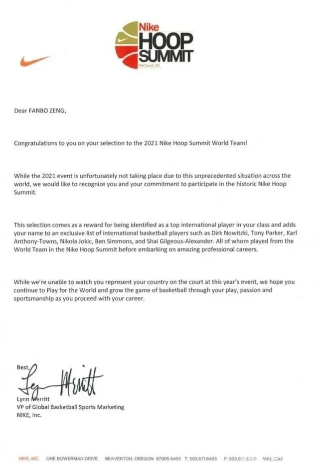曾凡博收到2021年Nike篮球峰会的邀请