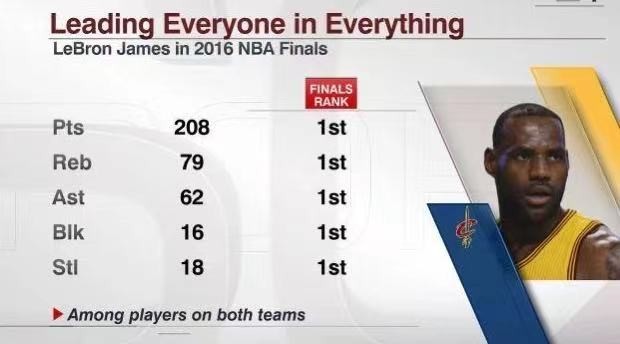 一般来说,总决赛期间包揽任意一项基础数据第一,都已经十分不容易,更不用说一项数据两队最高,那简直就是球队的大腿。而在2016年总决赛,詹姆斯却做到了五项基础数据、得分、篮板、助攻、抢断和封盖,均为骑士和勇士两队最高!那一轮系列赛,詹姆斯共拿下208分、79篮板、62助攻、16封盖和18抢断,各项数据均为两队球员中最多,这个纪录恐怕后辈也很难打破。