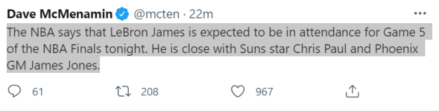更重要的是,詹姆斯将会和太阳球星克里斯-保罗以及太阳GM詹姆斯-琼斯坐得很近,因此,这也不得不让人联想到,难道詹姆斯是要在场外支招自己的好兄弟保罗吗?