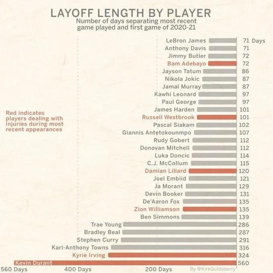 ESPN写手Kirk Goldberry统计的NBA球队以及部分球员休息时间。
