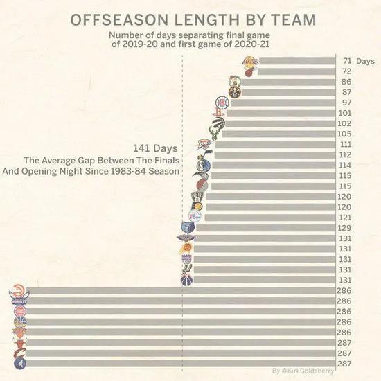 因为新冠疫情的原因,2020-21赛季的NBA赛程被压缩。从去年12月22日到今年5月16日之间,NBA安排了72场常规赛(原来是82场),这也造成了联盟历史上最短的休赛期,而全联盟中休赛期最短的要数两支上赛季争夺总冠军的队伍:湖人71天,热火72天。
