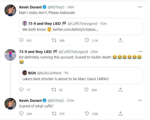 北京时间8月1日,詹姆斯的好友(73-9 and they LIED)在社媒上转发了一个球迷的言论,似乎在暗讽杜兰特害怕湖人的新三巨头。杜兰特本人第一时间现身评论区,回应詹姆斯的这位好友。