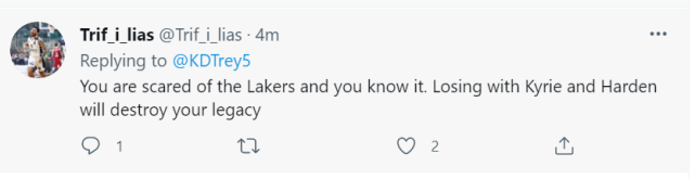 还有球迷回复杜兰特:“你害怕湖人,你知道这一点。和欧文、哈登组队要是输给湖人,会损坏你的成就。”