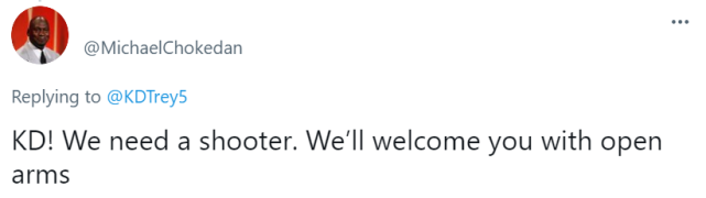 詹姆斯的好友没有再回复杜兰特,但已经有不少湖人球迷接过话茬,开始调侃杜兰特。一个球迷晒出了一张P图,图上是杜兰特和詹姆斯身穿湖人训练服的合影。他写道:“KD,我们需要一个投手,我们会敞开怀抱欢迎你!”