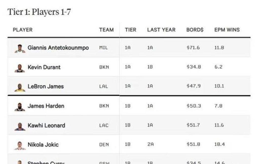 近日,知名媒体The Athletic发布了最新的球员排名,公布了联盟前7的球员。这份名单将球员分为1A和1B。1A队有三名球员:阿德托昆博,杜兰特和詹姆斯,另外四名球员都在1B级,分别是哈登,伦纳德,约基奇和库里