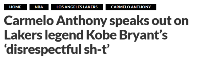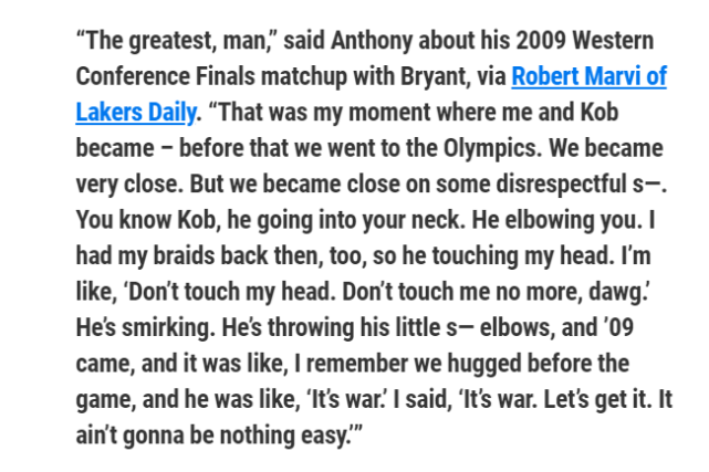 “他是最伟大的球员,”安东尼谈到他在 2009 年西部决赛与科比的对决时说。“那是我和科比对决的时刻。不过在我们参加2008年北京奥运会时,我们已经变得非常亲密,我们通过一些不尊重的方式建立情谊。”