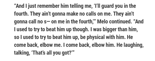 “你知道科比,他会在对抗时攻击你的脖子,他肘击你。那时我还留着我的脏辫,所以他摸了我的头。我就说:不要碰我的头,不要再碰我了,dawg(真的狗)。他就在笑,他挥动着他的小手肘。”