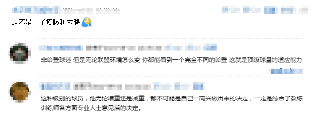当然,大部分网友对于哈登的努力还是非常肯定的,有人写道:“非哈登球迷,但是无论联盟环境怎么变,你都能看到一个完全不同的哈登,这就是顶级球星的适应能力”;还有人表示 :“这种级别的球员,他无论增重还是减重,都不可能是自己一高兴做出来的决定,一定是综合了教练训练师各方面专业人士意见后的决定。”