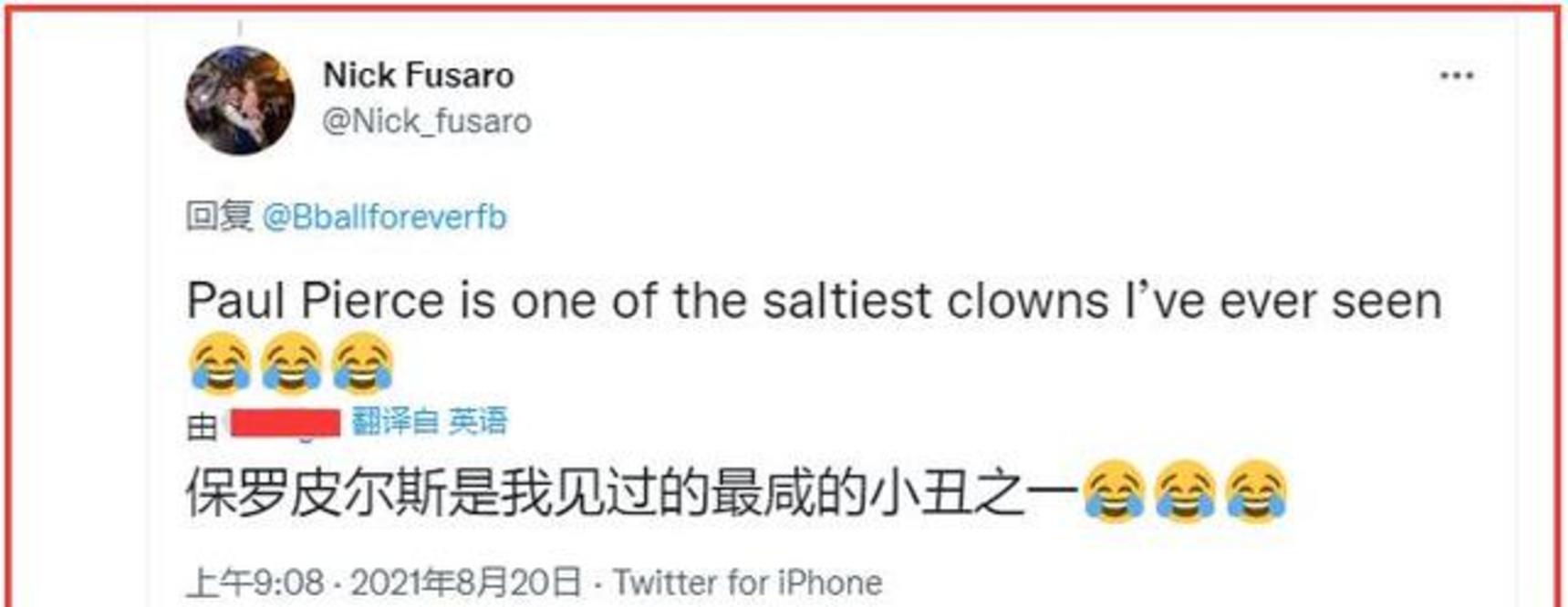 一位名叫Nick Fusaro的网友直接被激怒了:“皮尔斯是我见过的最咸的小丑之一。”
