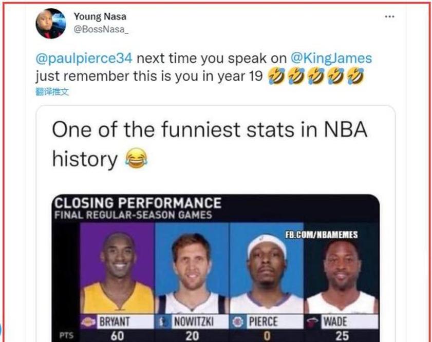不过也有网友展示了之前媒体列出的四位明星球员退役战数据对比的图片,并写道:“皮尔斯,下次再聊詹姆斯,记得这是第19季的你”,有五个笑哭的表情。