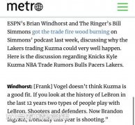 北京时间12月21日,ESPN名记Brian Windhorst在节目中表示,湖人队的主教练认为库兹马并不适合这支球队;Windhorst同时表示,这也是他认为库兹马本赛季表现挣扎的原因。因为沃格尔认为这