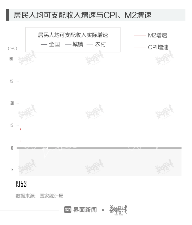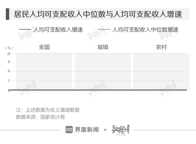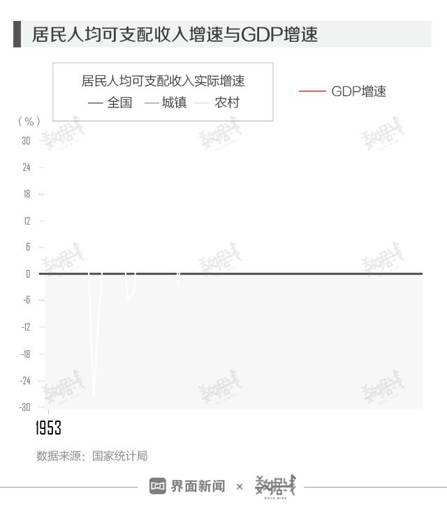 据界面数据(公众号ID:shujuxian_kuaikan)统计,自1981年起(人均可支配收入实际增速数据最早年份),居民人均可支配收入增速与GDP增速高度一致。