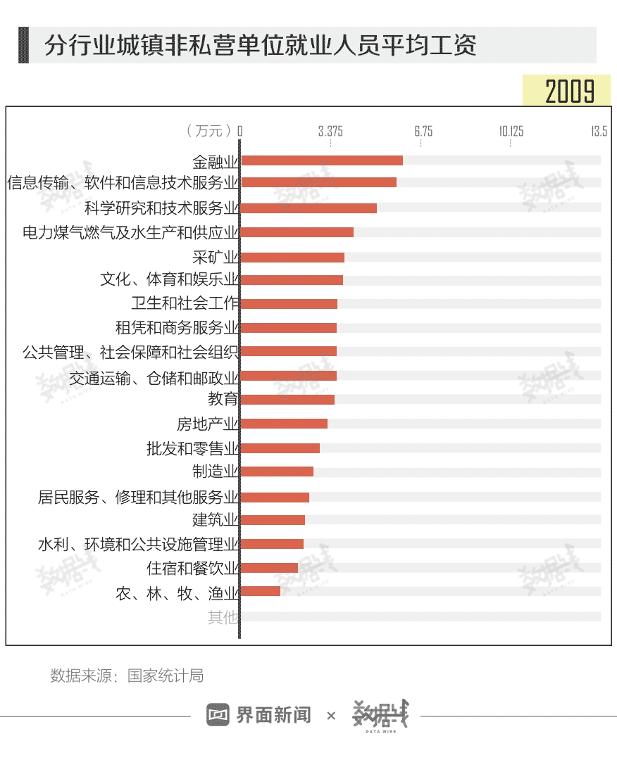 随着产业的兴衰变动,从业者的工资也在经历变迁。50-80年代,工资待遇最高的行业从城市公用事业、建筑业和运输邮电业转向水利、环境、采矿业等能源行业。在随后的年份中,房地产(自1993年)、金融业(自1995年)和信息传输、软件及信息技术服务等新兴行业(自2016年)陆续成为香饽饽。工资高低的变换也是中国商业逻辑变换的缩影。