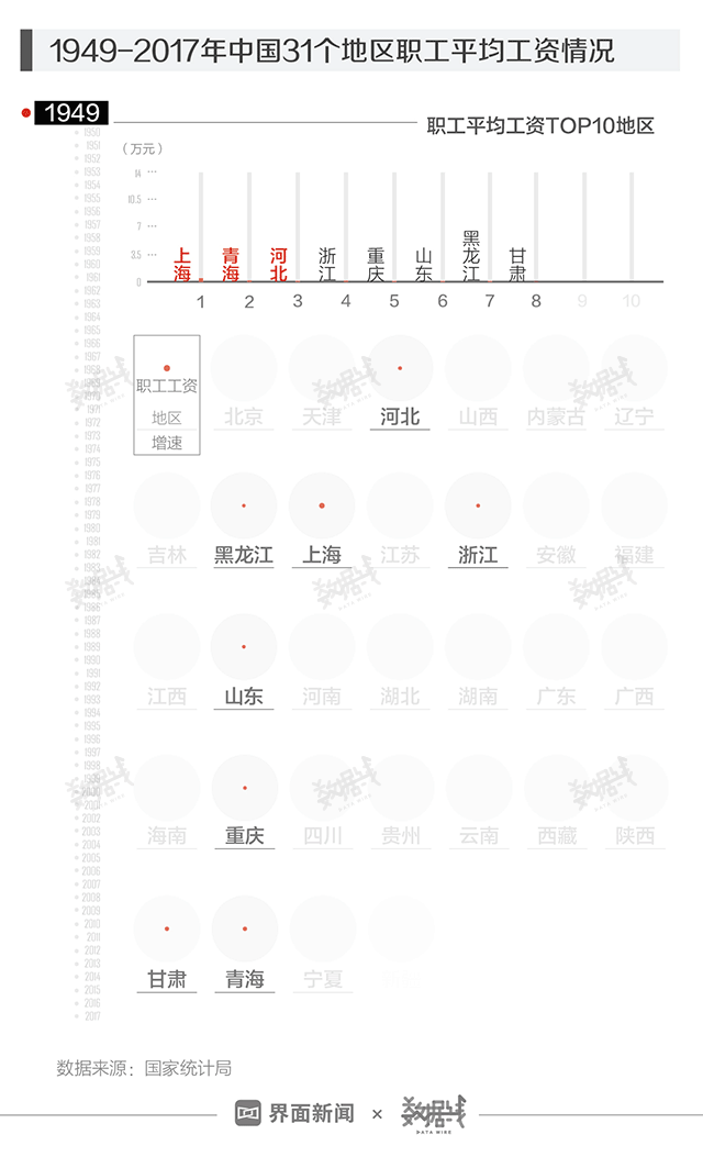 1955年,最风光的地区是青海,职工平均工资超过上海达到820元,并在随后十二年间,同上海轮番角逐“地区职工平均工资No.1”。但自1997年起,北京、上海开始基本持续“霸屏”地区职工平均工资前两位( 部分地区部分年份数据缺失)。