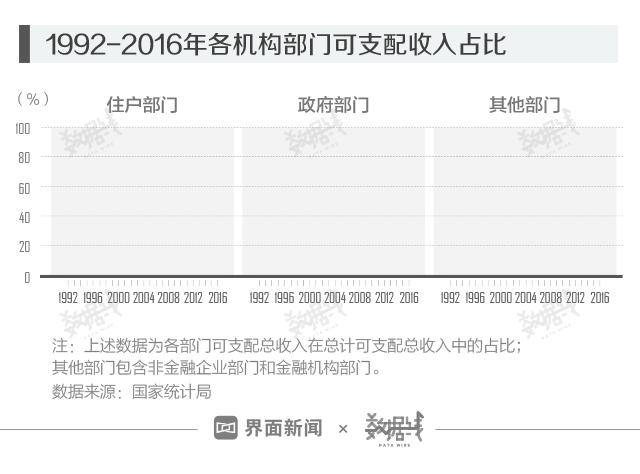 但你别慌!国家统计局还有另外一项数据,叫做“住户部门可支配收入”(来自中国资金流量表实物交易数据),1992年至2016年,中国住户部门人均可支配总收入在总可支配收入中的占比基本维持在60%左右。