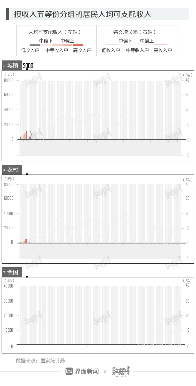 与此同时,2016年以来,全国和城镇高收入户及中等偏上收入户人均可支配收入涨幅均赶超低收入户。