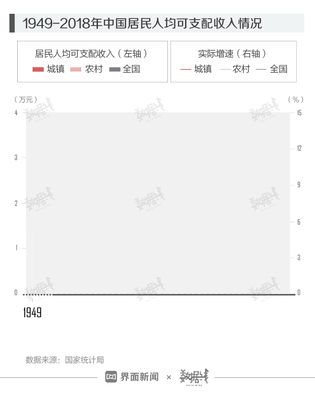 据国家统计局数据,1949-2018年,中国居民人均可支配收入由49.7元增长至2.8万元。其中,城镇居民的人均可支配收入一直高于农村,但从2010年起,农村增速开始超过城镇。