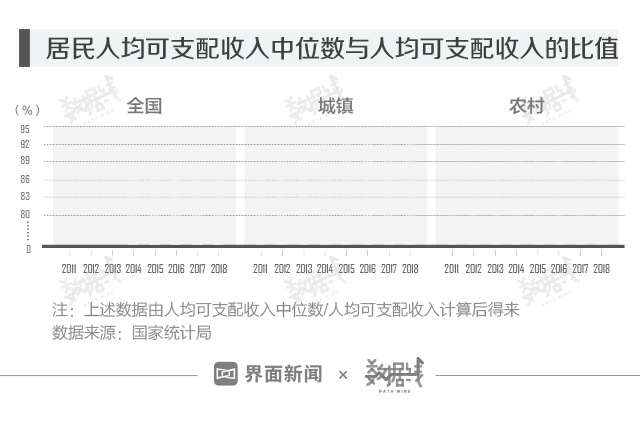 不过,自2016年起,全国、城镇及农村人均可支配收入中位数与平均数的比值均有所回落。截至2018年,上述比值分别为86.2%、92.8%和89.4%。