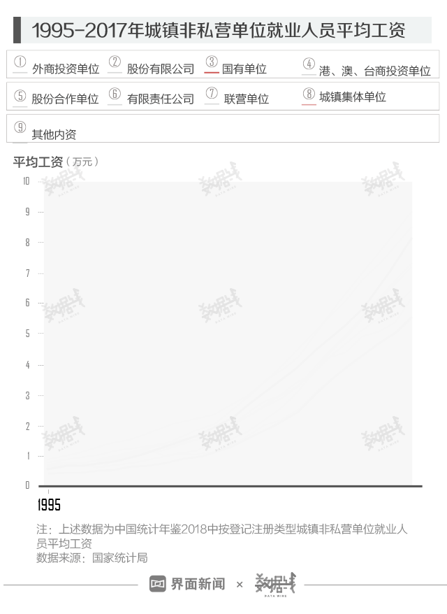 以城镇非私营单位为例,1995年-2017年,国有单位就业人员平均工资居于前三。其中,2017年,国有单位就业人员平均工资8.1万元,仅次于外商投资单位和股份有限公司。