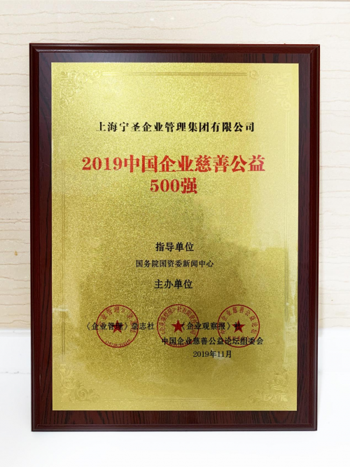 2019年11月30日,由国务院国资委新闻中心担任指导单位,《企业管理》杂志社、《企业观察报》社联合主办的“2019中国企业慈善公益500强发布暨第三届中国企业慈善公益论坛”在北京举行。上海宁圣企业管理集团有限公司被评选为2019年中国企业慈善公益500强。