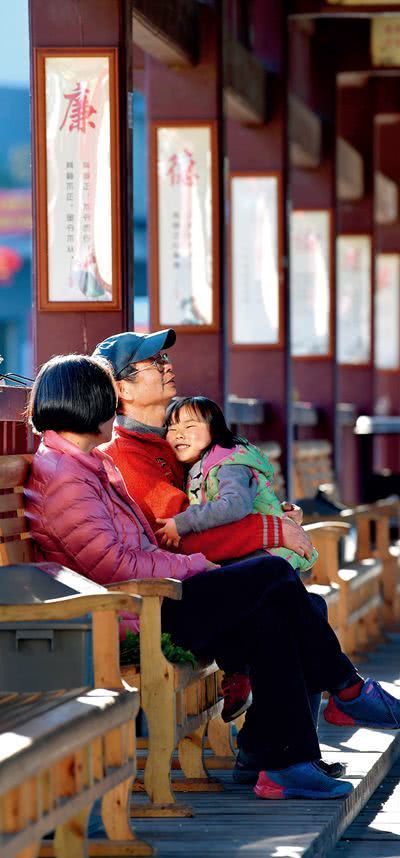 江西省宜春市袁州区温汤镇的文化长廊内,李有土和妻子带着小孙女在休息(2018年2月28日摄)彭昭之摄/本刊