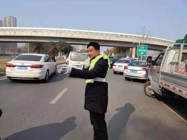 12月7日上午,因大雾天气,郑州市文化路连霍高速上站口封闭,此处车流出现严重堵车。为了疏导交通,他们,一直义务鏖战了5个小时。