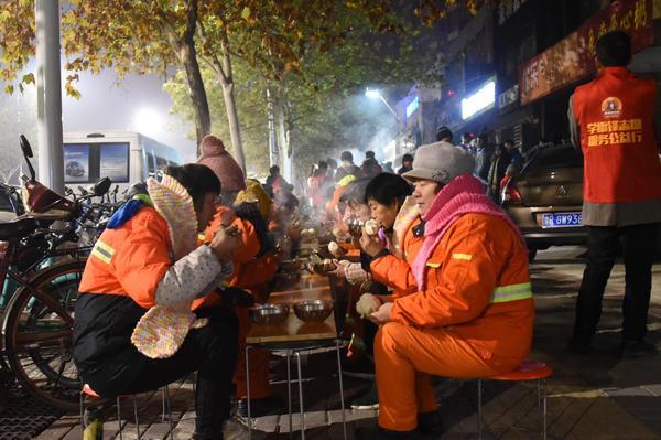 吃着热气腾腾的免费早餐,脖子上系着大学生们亲手织成的围巾,环卫工人顾女士称社会上有那么多的好心人在关心她们,天气再冷,心里也是暖烘烘的。
