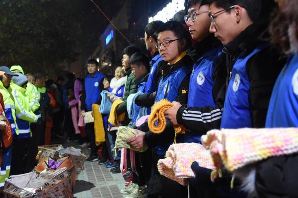 当得知这些爱心围巾是大学生志愿者用义卖报纸所得的钱,买来毛线一针一线亲手织成的时,免费爱心粥屋的发起人蒋爱荣女士也被深深感动,一再替环卫工向志愿者们表示感谢。